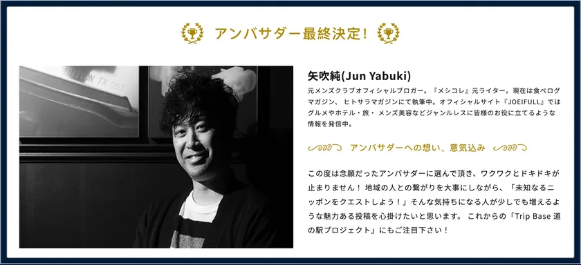 この度は念願だったアンバサダーに選んで頂き、ワクワクとドキドキが止まりません!地域の人との繋がりを大事にしながら、「未知なるニッポンをクエストしよう!」そんな気持ちになる人が少しでも増えるような魅力ある投稿を心掛けたいと思います。これからの「Trip Base 道の駅プロジェクト」にもご注目下さい!