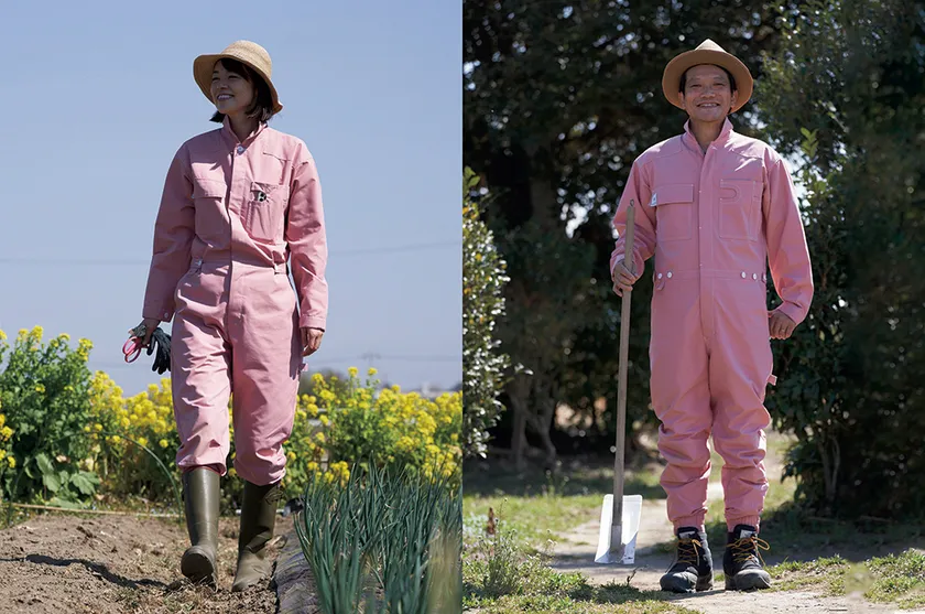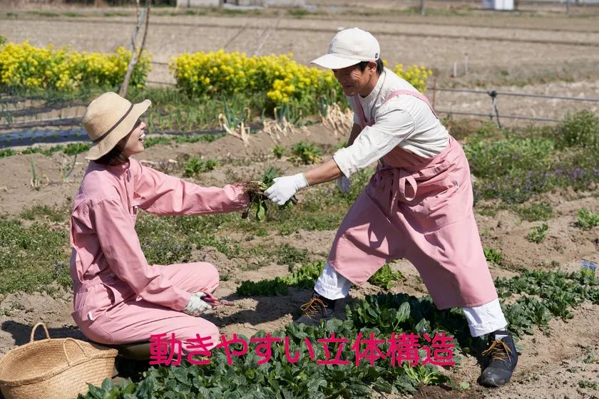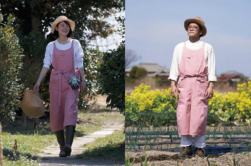 制作は「しゃがんだ時に腰が出ない長い丈」「襟が立てられると首周りの日焼け防止になる」「パンツの裾が絞られていると長靴に収まりやすい」などの意見を取り入れ、さらに作業を撮影できる携帯ポケットや作業しやすい立体構造パターンなど、普段から作業をする川瀬さんとパタンナーの経歴もあるデザイナーの坂寄 順子のお互いのアイデアがつまった内容になっています。