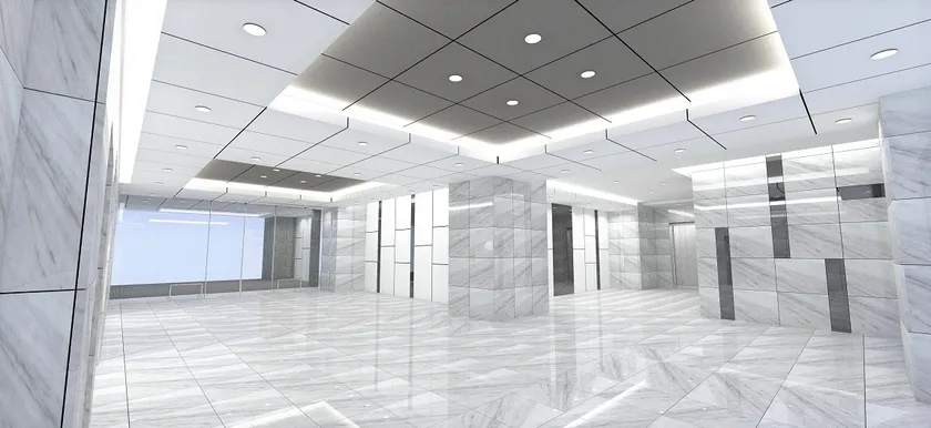 大切なお客様をお迎えするエントランスは、高級なイタリアの天然大理石「ビアンコカララ」を贅沢に用い、高い信頼感を創出しました。エントランスの天井高は3.5m、広さは、約180平米と、ゆとりある空間設計としました。
