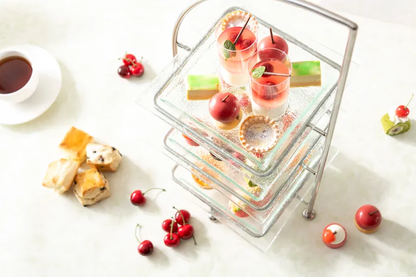 ブランド品種である「佐藤錦」やアメリカンチェリーを使用し、初夏の季節に甘酸っぱい味わいを楽しめる8種のスイーツやセイボリーが、ホテルの外観を模した3段のティースタンドに並びます。