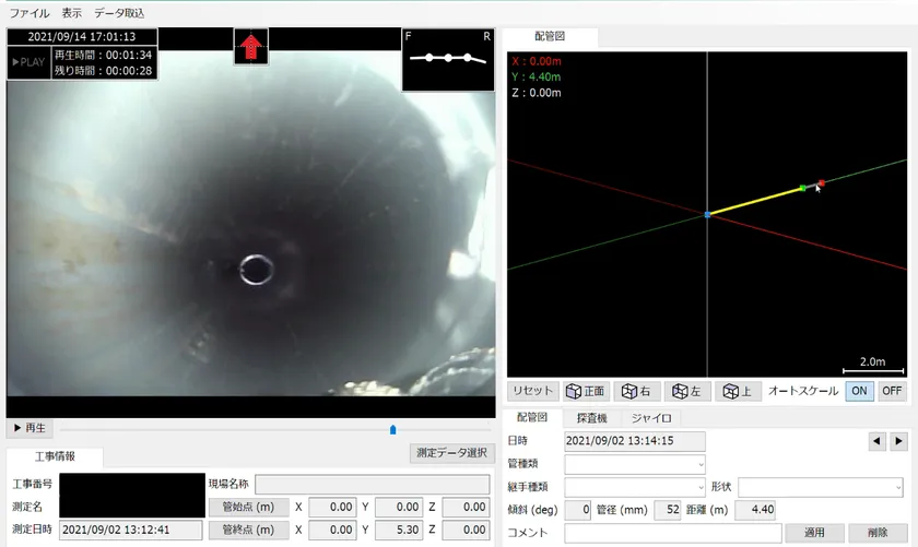 「配管くん(R)」で取得したデータはその場で、映像・図面モニタリングソフト「グッと調査」で確認する事ができます。