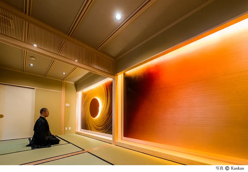 吉本氏によって生み出されたこのアート作品は「月輪(がちりん)」と名付けられました。高野山真言密教には「月輪観(がちりんかん)」と呼ばれる瞑想法があります。月の輪に見立てた真円を見つめ、その月輪を自己の心の中に映し、さらに自己の身体全体、その部屋全体へと月輪の心像を広げ、最終的には全宇宙にまで広げていく瞑想法です。この作品は月輪観に着想を得ています。真円から湧き上がる金箔の渦が壁面いっぱいに広がり、さらに別の次元の宇宙にワープし広がっていくかのような景色を表しています。真円には光源が設置され、周囲に向かって光が放たれます。宿坊恵光院の名前に因み、また真言密教の教主である大日如来を尊び、光によって金箔を浮かび上がらせるような表現となっています。