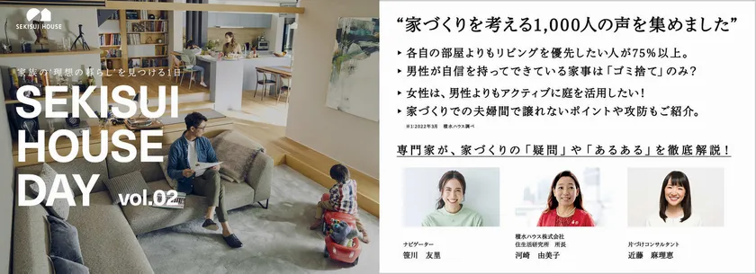 暮らしの当たり前がどんどん変化する中、夫婦の価値観も大きく変わってきているようです。「SEKISUI HOUSE DAY vol.02」では理想の暮らしを見つけるため、最近、家を建てた・これから建てる男女1,000人を独自調査し、家づくりの「疑問」や「あるある」を徹底解説。