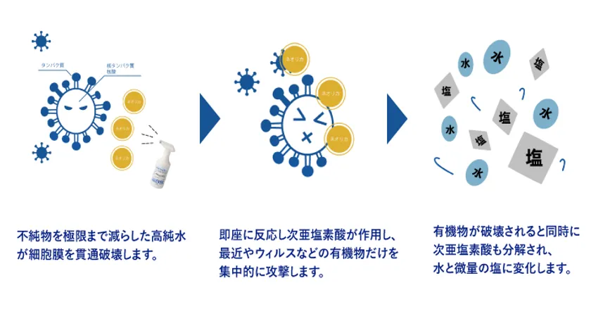 医療分野で消毒剤の認定成分である次亜塩素酸ナトリウムに、従来の製品で様々な問題とされてきた要素を改善した「安定型次亜塩素酸ナトリウム」を使用しています。次亜塩素酸ナトリウムやアルコール系消毒液のデメリットを解消し、目や肌、口内に入っても安全な、人にも環境にも優しく、小さなお子様のいらっしゃるご家庭でも安心してお使いいただけます。