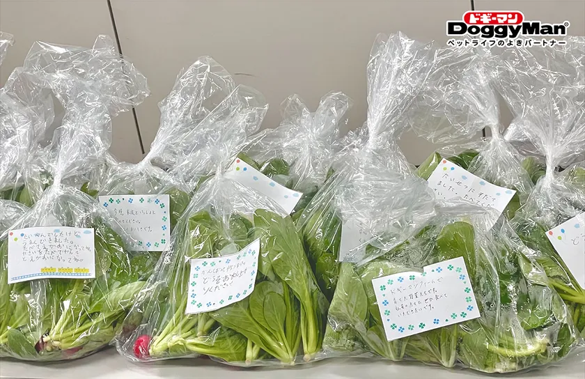 ドギーマンファームのお仕事は、野菜の栽培を通して、社員を含め、世界の人々に健康と笑顔を届けることです。収穫した野菜は福利厚生の一環として社内で配布する他、社会貢献活動にも活用いたします。ドギーマンファームからドギーマン社員へ健康と笑顔を送り、ドギーマン社員から世界に健康と笑顔をお送りするというフローになります。
