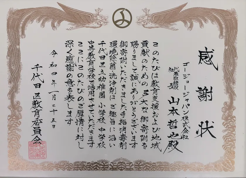 医療をはじめ介護・教育・オフィス分野などで信頼いただける衛生環境を提供し続けているゴージョージャパン株式会社は、新型コロナウイルス感染症の勢いも治まらず、受験を控えた学生も多いシーズン中、感染対策強化および教育環境支援と地域貢献の一環として2021年11月~2022年2月に千代田区教育委員会へ寄贈を行い、2022年1月25日に千代田区役所にて感謝状贈呈式が行われました。