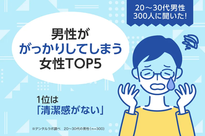 株式会社デンタルラボ(本社:東京都渋谷区)の運営するセルフ美容デンタルサロン「デンタルラバー」は、20~39歳男性300人を対象に「女性にがっかりするポイント」について調査。「男性ががっかりしてしまう女性TOP5。1位は『清潔感がない』」に関するインフォグラフィックを制作・公開しました。