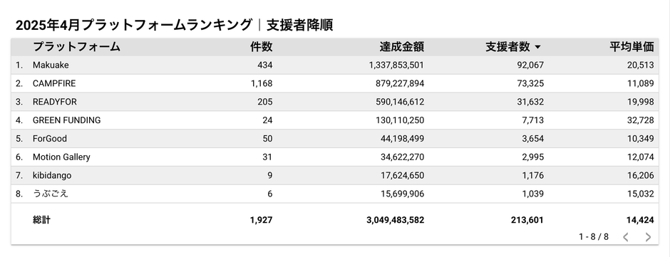 2025年4月に実施されたクラウドファンディングの達成金額ランキングTOP5では、支援額・支援者数・平均単価・達成率の各データが以下のように発表されました。