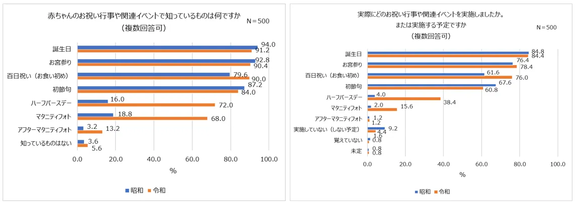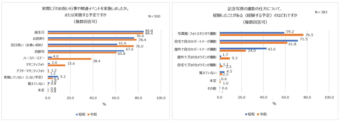 また、実際に各イベントを実施したか、または実施する予定かを調査すると、認知度と同様に「誕生日(昭和親84.8%・令和親84.4%)」、「お宮参り(昭和親76.4%・令和親78.4%)」が実施率が高い傾向が分かりました。令和親からの認知度が比較的高かった「ハーフバースデー」は約4割、「マタニティフォト」は15.6%と約6人に1人の令和親が実施する(した)という結果になりました。