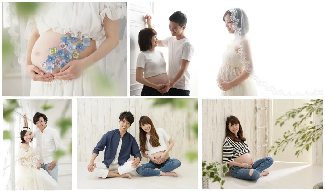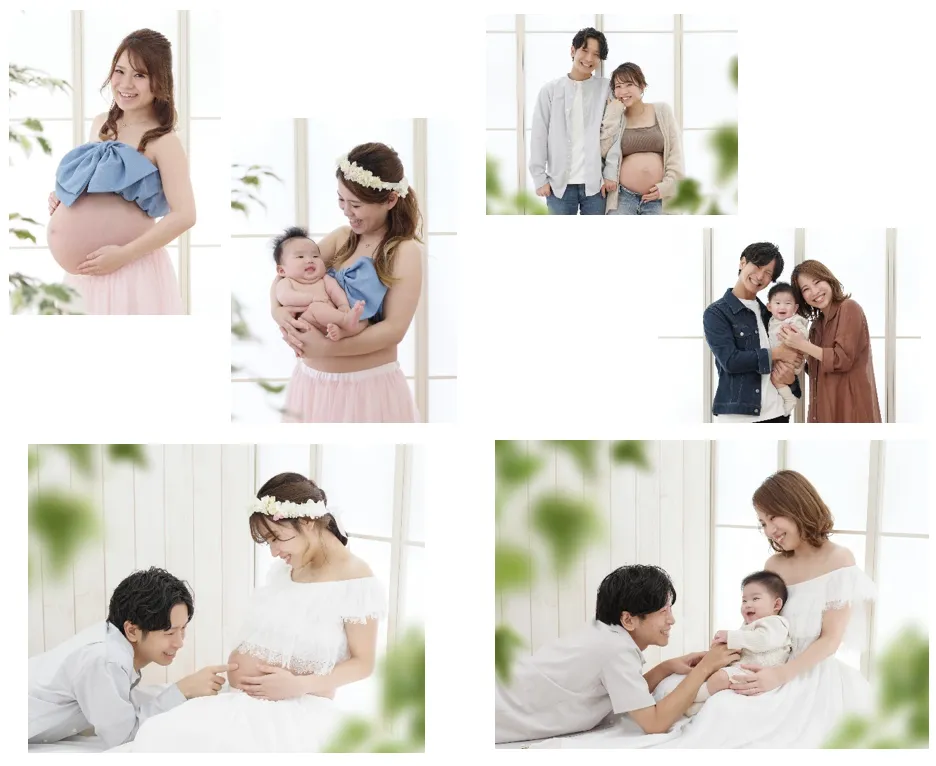 スタジオアリスでは、出産前の貴重な瞬間を美しく残す「マタニティフォト」の撮影をご用意しています。光があふれる背景や、やさしくあたたかな雰囲気を演出するナチュラルテイストなセットで、ご家族の幸せに包まれた姿を写し出します。マタニティドレスはもちろんのこと、お兄ちゃん、お姉ちゃんとなるお子さまの衣装代も無料でお貸出しさせていただきます。
