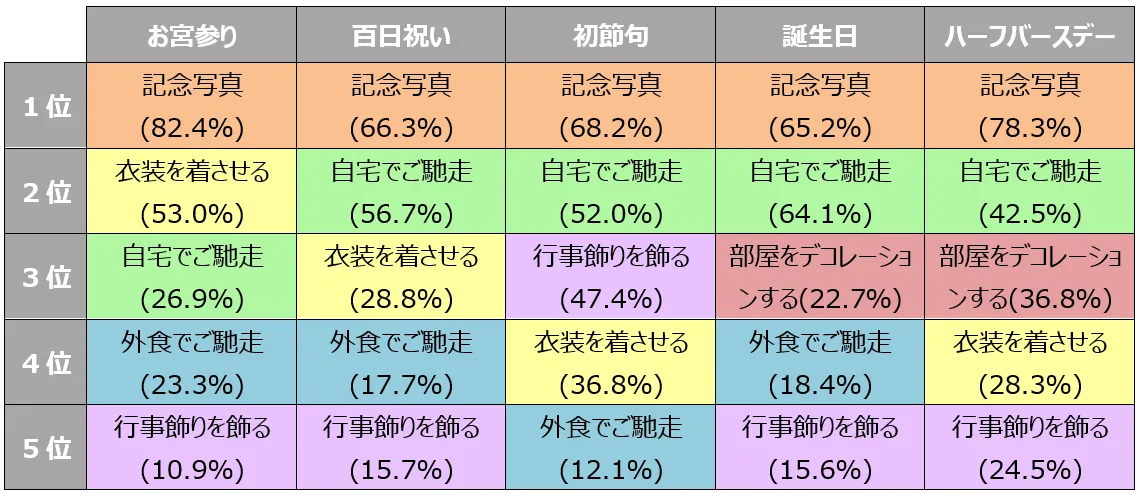続いて、各行事の祝い方について調査しました。それぞれTOP5をランキングにすると、1位はどの行事においても6割を超えて「記念写真」となりました。節目を迎えるタイミングで、赤ちゃんの姿を思い出に残したいと考える親が多いことがうかがえます。2位に多かったのは「自宅でご馳走を食べる」でした。また、お宮参りや百日祝い、初節句といった、伝統的な衣装がある行事は「衣装を着させる」という回答が見られたほか、誕生日やハーフバースデーでは、「部屋をデコレーションする」という回答が上位に並びました。