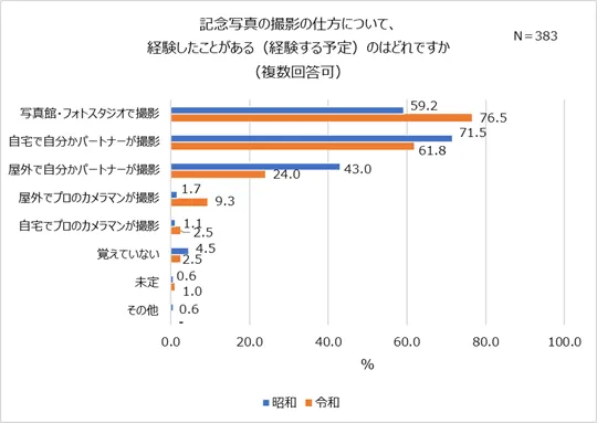 一番実施する人が多かった「記念撮影」について、どのような方法で撮影するかを聞くと、意外にも令和親の方が「写真館・フォトスタジオで撮影(昭和親59.2%・令和親76.5%)」する家庭が多いことが判明。一方、昭和親は「自宅で自分かパートナーが撮影(昭和親71.5%・令和親61.8%)」に多くの票が集まりました。気軽に行ける写真館やフォトスタジオが増えたことが背景の一つとしてありそうです。