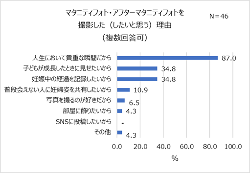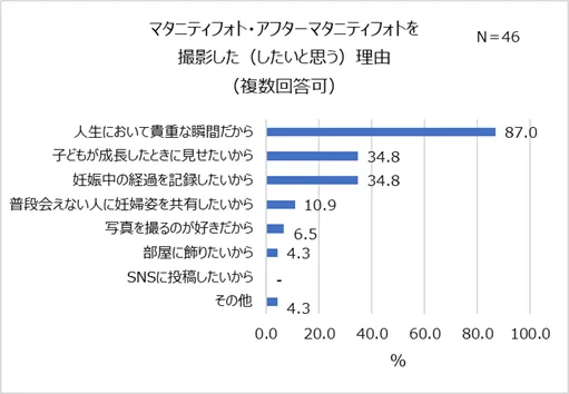 令和親の間で浸透しつつある「マタニティフォト」や「アフターマタニティフォト」。実際に撮影した親はどのような目的で撮影したのでしょうか。撮影した理由を聞いてみると、SNS投稿を目的にマタニティフォトを撮影する人はおらず、8割以上が「人生において貴重な瞬間だから(87.0%)」と答えました。誰かに共有するというより、妊娠出産は人生の中でも数少ない経験だからこそ、思い出に残したいと考える親が多いようです。次いで、「子どもが成長したときに見せたいから(34.8%)」、「妊娠中の経過を記録したいから(34.8%)」が並び、子どもとのコミュニケーションや、経過記録を目的に撮影する傾向もうかがえました。