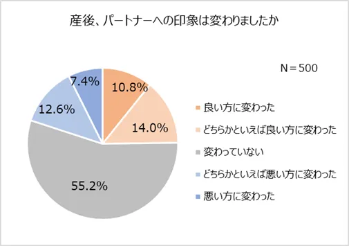 出産を経て、“夫婦二人きり”から、“親”へと立場が変わるにあたって、パートナー間で気持ちの変化はあるのでしょうか。産後、パートナーの印象が変わったか調査すると、「変わっていない(55.2%)」が約半数を占めました。一方で、「良い方に変わった(10.8%)」、「どちらかといえば良い方に変わった(14.0%)」が24.8%、「悪い方に変わった(7.4%)」、「どちらかといえば悪い方に変わった(12.6%)」が20.0%と、良い方・悪い方それぞれ変化を感じている人もいることもうかがえました。