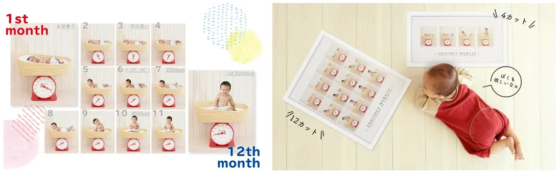 スタジオアリスでは、0~1歳までの赤ちゃん限定メニューとして「すくすく成長フォト(体重計撮影)」をご用意しています。お子さまの実際の体重をメモリで表示できる体重計撮影は、続けて撮影することでお子さまの成長が一目でわかる特別なフォトメニューです。「お宮参り」「ニューボーンフォト」「百日祝い」「ハーフバースデー」「200日記念」「300日記念」「初節句」「お誕生日」など、様々な節目で撮影することができます。また、体重計の写真だけで作る特別なデザインフォト「成長記録デザインフォト」もご用意しています。“初めての12か月”を記念に残しませんか。