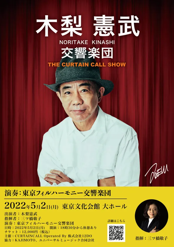 クラシック専門ストリーミング配信プラットフォーム「CURTAIN CALL」を運営する株式会社12DO(所在地:東京都大田区、代表取締役社長:酒井光一)は、「木梨憲武 交響楽団」を東京文化会館にて2022年5月2日(月)に開催いたします。