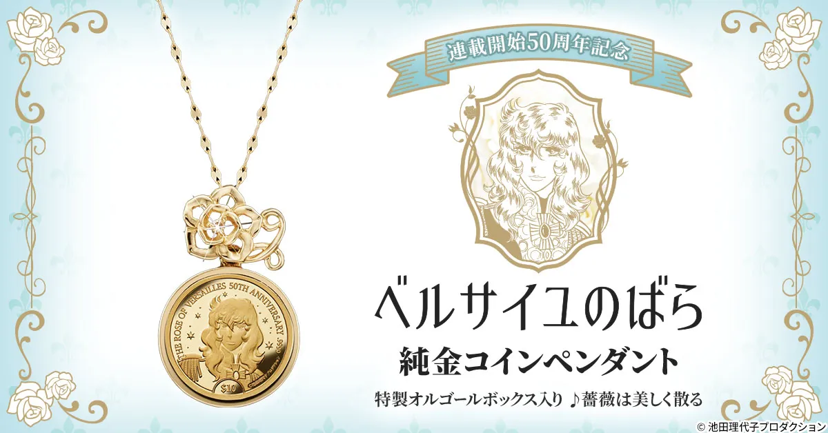 フランス革命前後のフランスを舞台に、人々の苦悩や喜び、愛と死を鮮やかに描いた、不朽の名作『ベルサイユのばら』の50周年を記念して、英連邦クック諸島政府から発行される特別な記念金貨を使用した「純金コインペンダント」が登場しました。