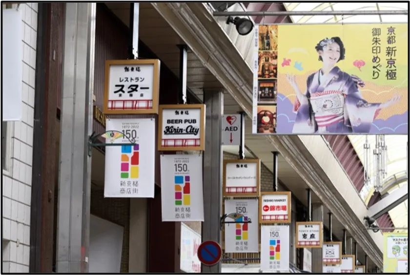 新京極通開通150年を記念して「150年記念ロゴマーク」を使った新京極商店街内での記念装飾を実施。各店舗に設置している統一看板と新京極商店街の入り口となる三条通・四条通側の昇降機に同ロゴマークを使ったターポリン素材の看板を設置しています。