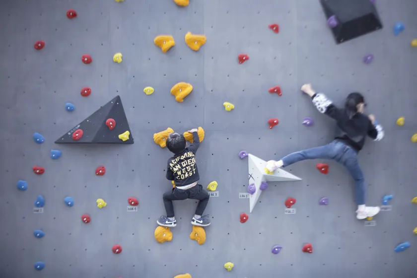 ボルダリングは道具を一切使わず、壁面にならんだ、カラフルな石(ホールド)に手足を乗せて登るスポーツです。自分のレベルに応じてつかむホールドが決まっているので、成長具合を感じながら楽しむことができます。高さ4m幅10mのクライミングウォールです。様々な難易度のコースを楽しんでください。