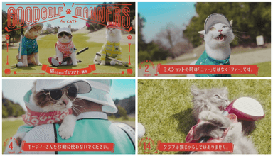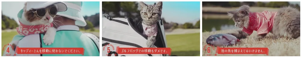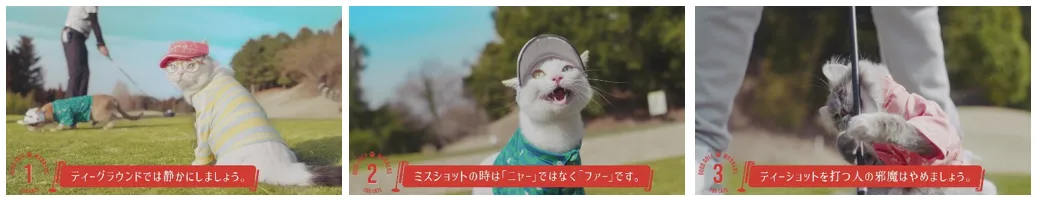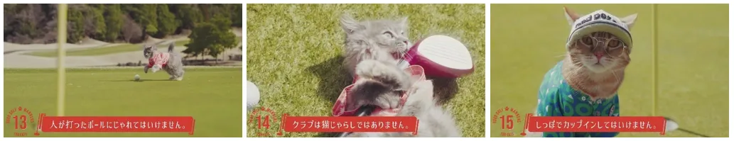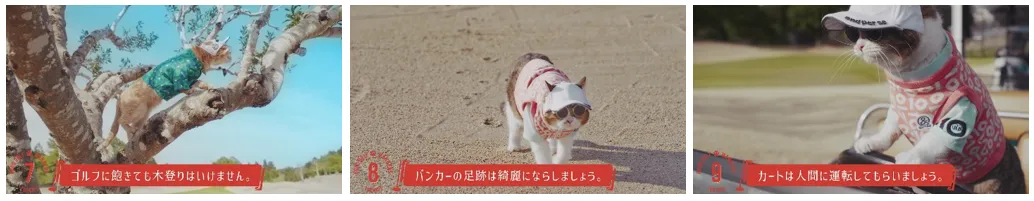 本動画では、15個に及ぶ“猫版”のゴルフマナーを、猫がNG例を実演してご紹介。芝生でまったりとくつろぐ様子やクラブとじゃれる様子など、猫たちの微笑ましい姿が映し出されます。動画の最後には、猫が人間に対し、マナーに囚われすぎる必要はない、「ゴルフはもっと自由でいい」というメッセージをクールに伝えます。
