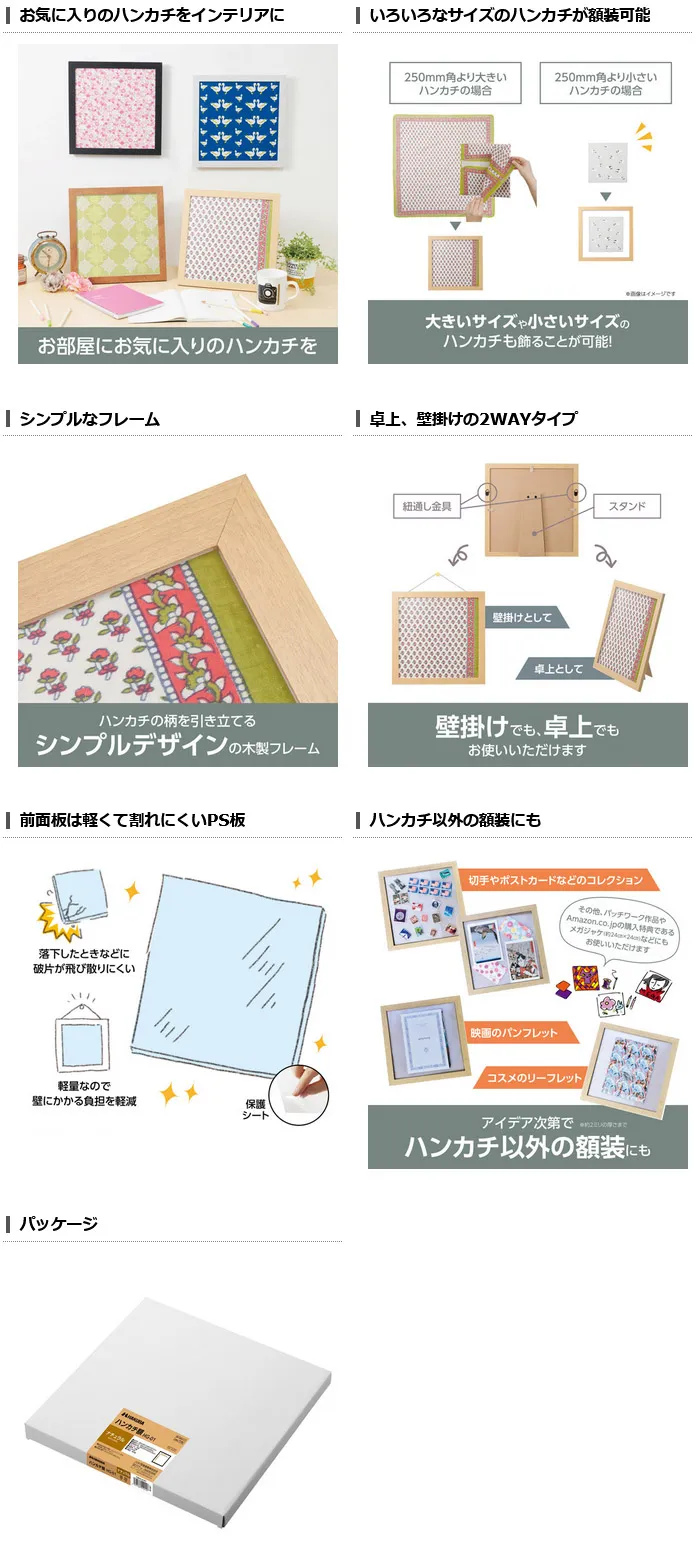 お気に入りのハンカチを飾って楽しめる、シンプルなデザインの正方形額縁。約250×250mmのハンカチにちょうどいいサイズです。(厚さ約2mmまで)