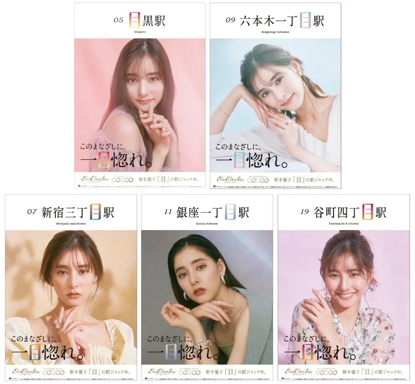 3月から新たに新木優子さんをモデルに迎え、さらに皆様の「目」に寄り添っていきたいという思いから、今回は全国「目のつく駅」への広告展開をさせていただきました。駅ごとに「目」の色が違っており、どの駅の「目」も可愛くナチュラルに盛れていると思います。