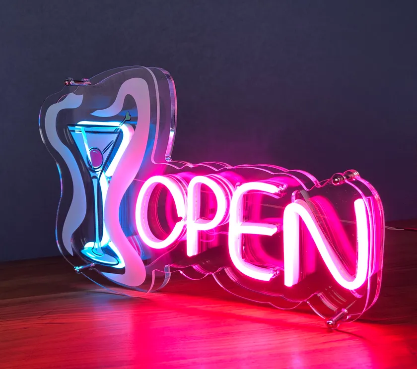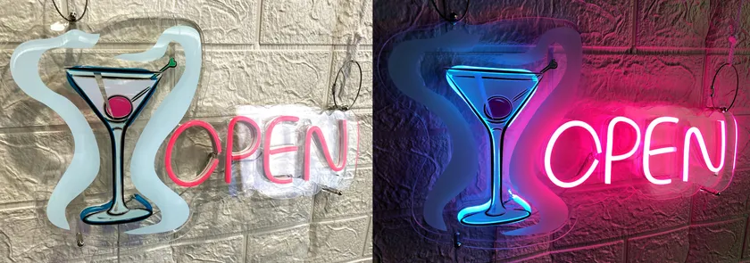 アクリルにUVインクジェット印刷を施し、レーザーで形を自由にカット、LEDネオンチューブを曲げて文字などを作り光らせることができます。