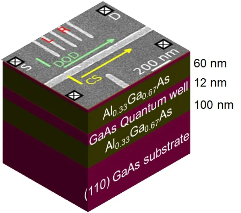 図1:(110)面上に作製した二重量子ドット(DQD)と電荷計(CS)の電子顕微鏡写真。