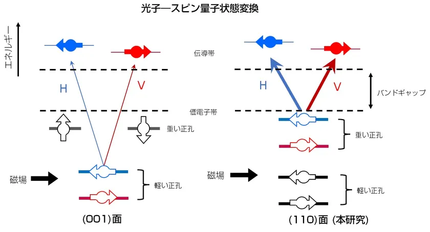 従来の (001)面上GaAs量子ドット:重い正孔 のスピン状態は磁場下で分裂せず量子状態転写ができない。(110)面上GaAs量子ドット:重い正孔のスピン状態も磁場下で分裂し量子状態転写が可能となる。