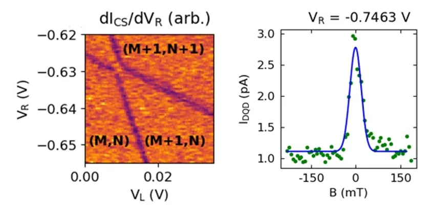 カッコの中のMやNは電子数を表す。(右)2電子領域のスピン依存電流の磁場依存性。ゼロ磁場付近では核スピンとの相互作用による電流が観測され、その解析から電子スピンのg因子が0.1であることを明らかにした。