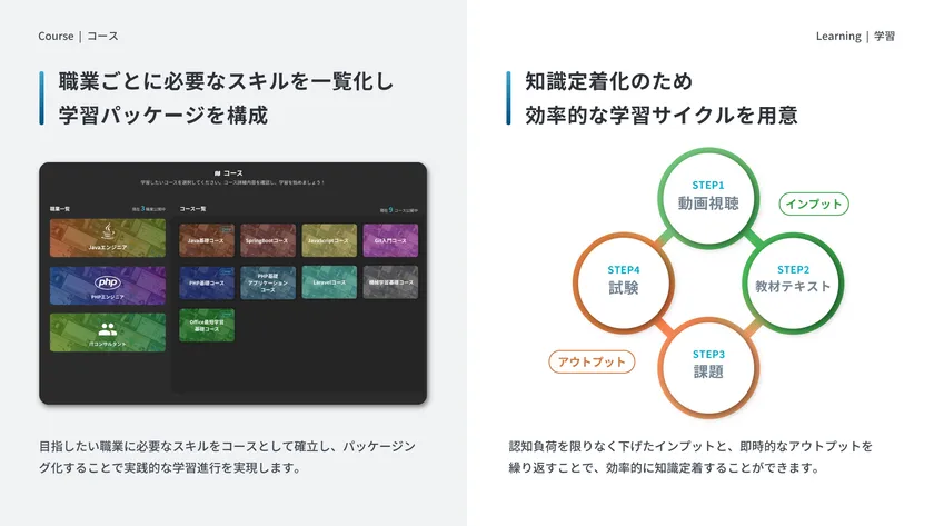 未知の情報を学ぶ前に全体像を把握するための動画を用意することで学習負荷を軽減、学習以外のストレスを排除するUI/UX、時代にあった教材表現など私達のこれまで培った教育ナレッジをすべてこのプラットフォームに詰め込みました。