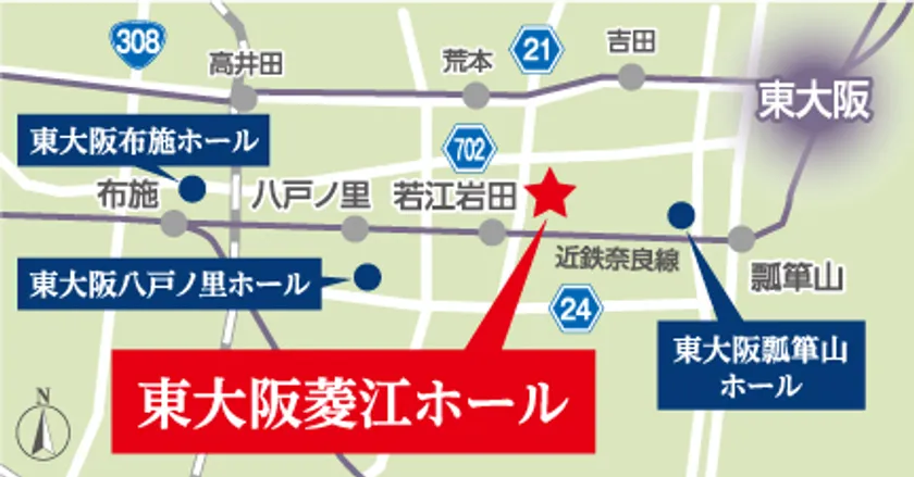 東大阪市では既存の3ホール(瓢箪山ホール、八戸ノ里ホール、布施ホール)に続き4ホール目のオープンとなる「家族葬 千の風 東大阪菱江ホール」は駐車場13台分設置、阪神高速13号東大阪線中野出口から約1km、車で約4分、近鉄バス菱江バス停からは徒歩約1分とご来館される皆様がアクセスしやすい立地となっています。
