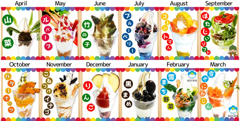 そんな信濃町の『旬』を多くの方に知ってもらいたいことから始めた旬のフェアは今年で3年目を迎えます。野菜にあまり興味を持っていない方にもとにかく知っていただこうと、人気の「黒姫高原牧場牛乳ソフトクリーム」に地元で採れた旬の野菜をトッピングしました。月替わりで楽しめる旬のソフトクリームを是非コンプリートしてみてください。