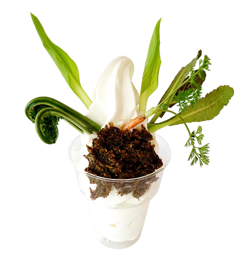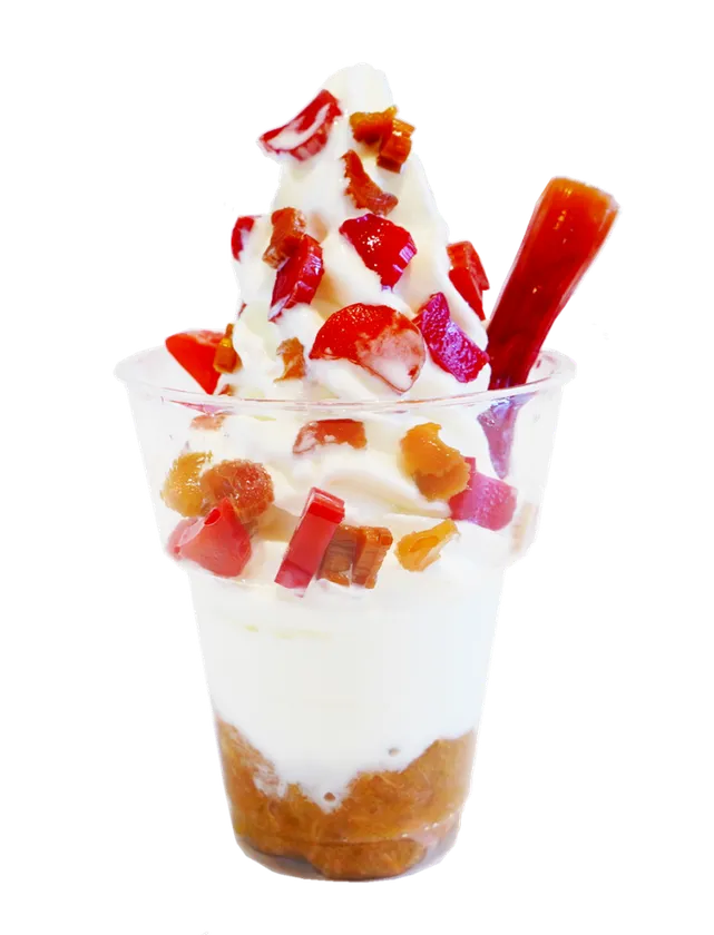 信濃町特産の野菜「ルバーブ」の酸味を活かした甘酸っぱいソースと砂糖漬けをスライスして散りばめた、鮮やかなソフトクリームです。