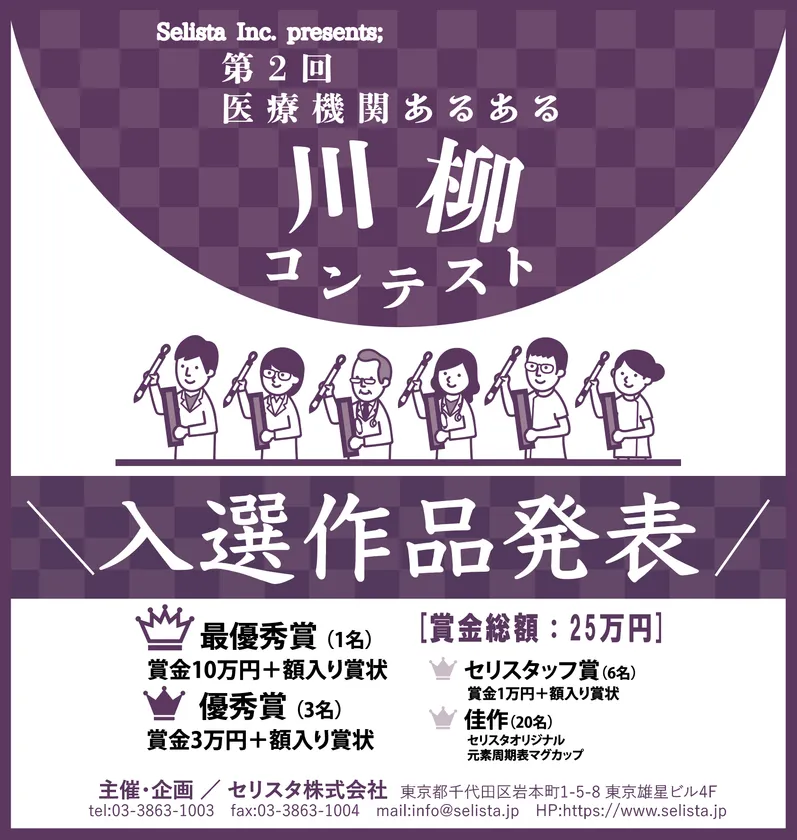 セリスタ株式会社(所在地:東京都千代田区、代表取締役:伊藤 承正)は、2021年12月20日から2022年3月31日の期間に募集しておりました『第2回 医療機関あるある川柳コンテスト』の入選作品を発表致します。