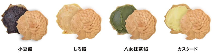 ほくほくとした口当たりが自慢の自家製餡より厳選した北海道産の小豆を使用した小豆餡、粒を絶妙に残した粒手亡餡(つぶてぼうあん)、福岡八女のこだわりの抹茶をふんだんに使用した八女抹茶餡、小さなお子様も大好きなカスタードと4つの味のたい焼きをご準備しています。