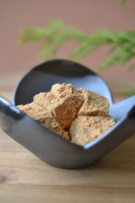 つるっつるのひんやり食感の『わらび餅』。厳選した本蕨粉から作り出す絶妙な柔らかさに作られた懐かしいひと品です。国産大豆を深煎りしたこだわりの黒寿きな粉をふんだんに使用し、プルンとしたわらび餅ときな粉の相性が絶妙です。
