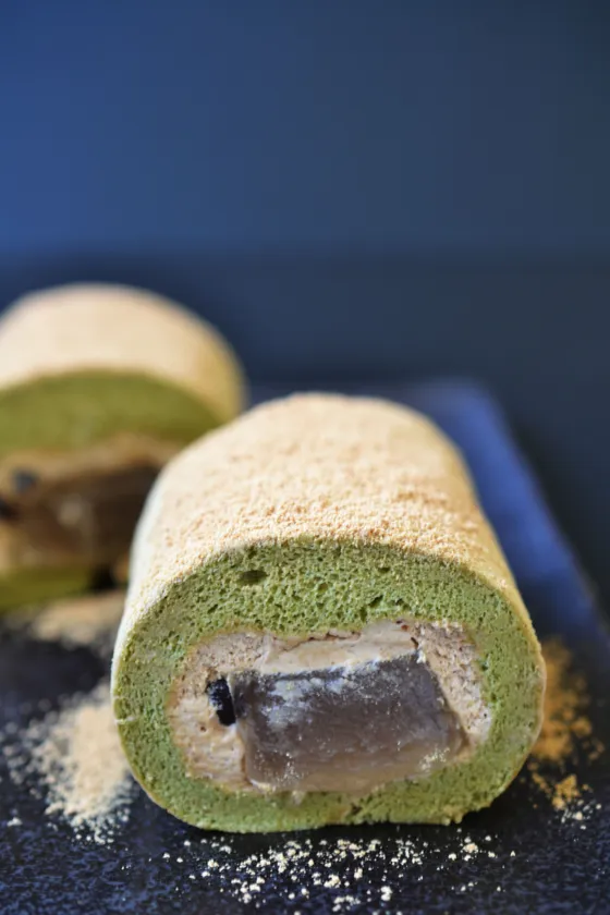 和菓子と洋菓子のいいとこどりをしたひと品。しっとりとした抹茶の生地に、こだわりの黒寿きな粉を混ぜ込んだ生クリームを巻き、その中心にはわらび餅を入れ込みました。ふわふわ、しっとり、だけどつるんともっちり。今までにない新感覚の和洋菓子に仕上がりました。