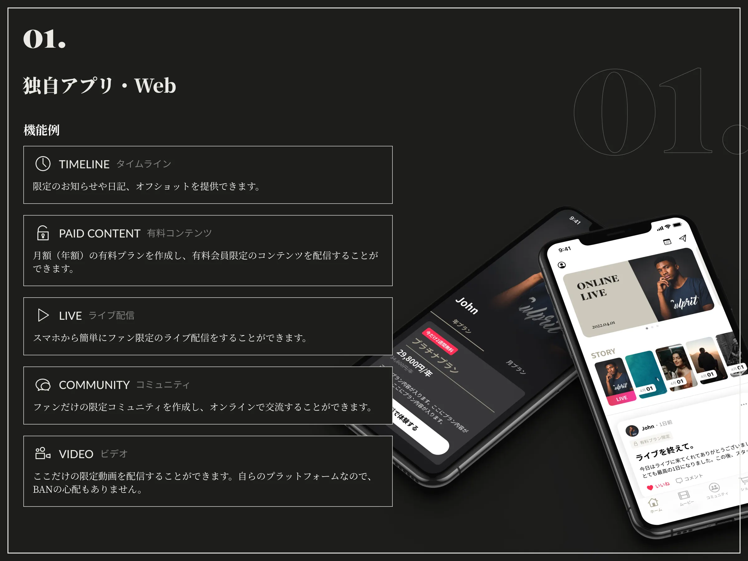 独自アプリ・Webプラットフォームの制作、独自ライブ配信サービスの制作、独自クラウドファンディングの企画と制作など、個々の著名人やインフルエンサーに最適化した「専用のプラットフォーム」を提供します。