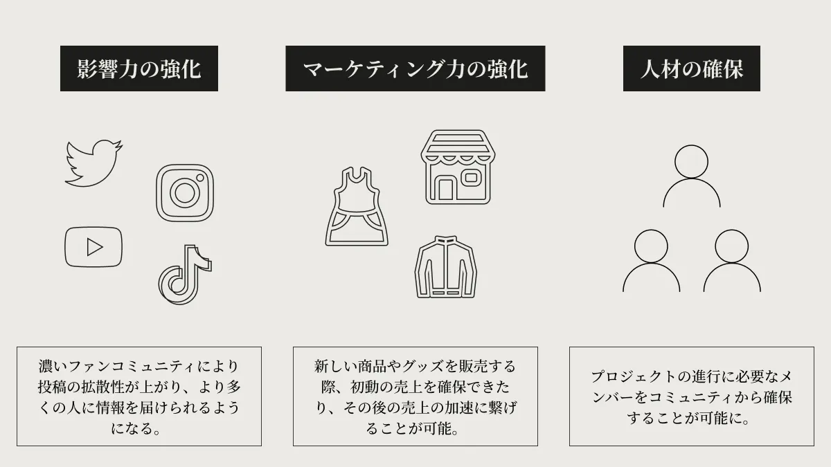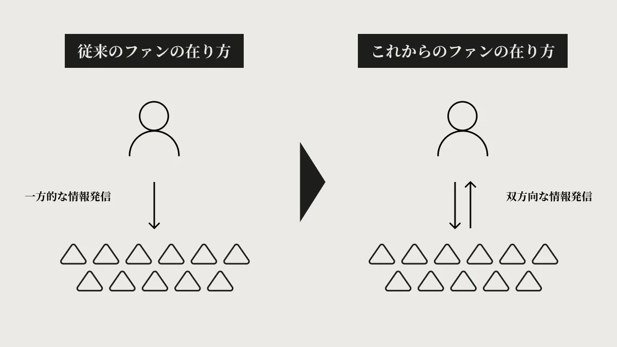 今まで多くのインフルエンサーは一方的にコンテンツを発信しファンがそれを楽しむという構造でしたが、これからは共通の目的をもつファン同士で作り上げていくエネルギーの大きいファンコミュニティが求められています。