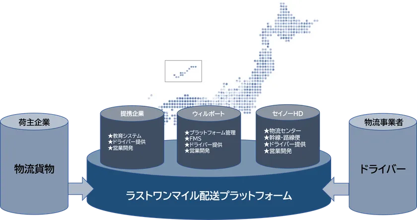 中堅及び小規模事業者が活用できるラストワンマイル配送プラットフォームの構築を目指すウィルポート株式会社(本社:東京都中央区、代表取締役:藤原 康則、以下 ウィルポート)はセイノーホールディングス株式会社(本社:岐阜県大垣市、代表取締役社長:田口 義隆、以下 セイノーHD)と中堅及び小規模事業者が活用できる「オープン型ラストワンマイル配送プラットフォーム(以下 O.L.P.)」の提供を開始いたしました。加えて、O.L.P.の全国展開推進を目的とした業務提携に関する協議を開始いたしましたことを、お知らせします。