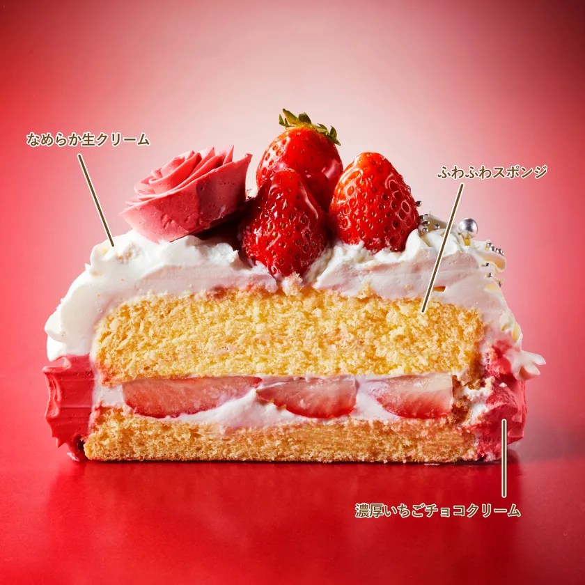 自慢のふわふわスポンジのショートケーキを、優しい生クリームと濃厚いちごチョコレートクリームの2種のこだわりクリームと、ウェディングケーキで磨き上げた絞りの技術で纏います。
