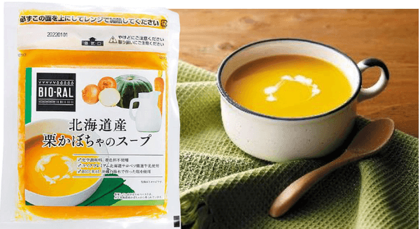 北海道産の栗かぼちゃペーストを使用。「ライフプレミアム北海道サロベツ豊富町厳選牛乳」と国産のにんじん・たまねぎ、クリーミーさを出すために口どけの良い北海道産リュクスチーズを加えました。やさしい甘みのかぼちゃとコクのある厳選牛乳を合わせ、旨みや甘みを感じられる「BIO-RAL沖縄の海水で作った塩」でほんのり塩気をプラスし素材の味を引き出しました。