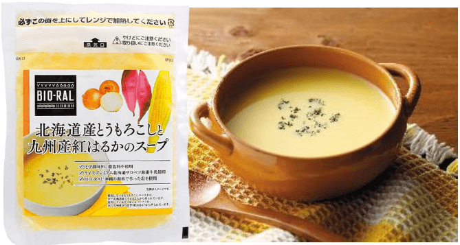 北海道産とうもろこしのペーストと鹿児島県産紅はるかのペーストを使用。「ライフプレミアム北海道サロベツ豊富町厳選牛乳」と国産たまねぎのソテーを加え、「BIO-RAL沖縄の海水で作った塩」で味を調えました。