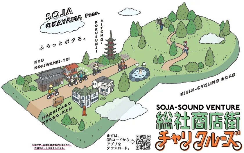 サウンドツアー「SOJA-SOUNDベンチャー」のご利用には、Sound ARアプリケーション「Locatone(TM)(ロケトーン)」が必要です。アプリを起動し、「SOJA-SOUND ベンチャー」チャンネルから「総社商店街チャリクルーズ」を選択すると、事前にセットされた合計11個のスポットに訪れるたびに音声ガイドが流れます。今回のサウンドツアーは特に商店街にスポットを当て、ただの観光地巡りではなく、隠れた店・人に出会ってもらうルートを楽しめます。