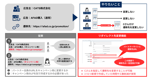 CATS株式会社(本社:東京都新宿区、代表取締役社長:松本 勇)は、自社アフィリエイトシステム『AFAD』において、「リダイレクト先変更機能」を実装しました。