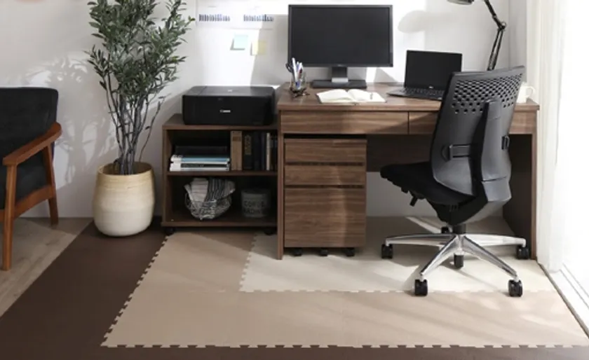人気を集めているジョイントマットは、45cm角と従来の商品タイプよりやや大きめのサイズ。大判サイズなので、少ない枚数でお部屋にマットを敷き詰めることが可能となっています。また、1セットにつき2色または3色のミックス仕様になっているので、空間の間仕切りとしても活用可能。テレワークスペースと子どものプレイゾーンを分ける役割も果たします。