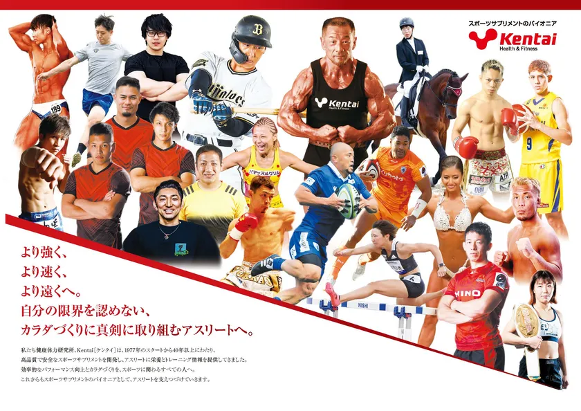 その後も、業界初の大容量プロテインや、アミノ酸サプリメント、CFM製法のホエイプロテイン、クレアチンなど、その時代の最先端のサプリメントを商品化してきました。Kentaiはスポーツサプリメントのパイオニアとして、長年の歴史で培った経験を活かし、アスリートをはじめ、健康で快適なライフスタイルを追求するスポーツ愛好者へ向け、回復、燃焼、持久、筋力に効果のある安心安全なサプリメントを、これからも提供していきます。