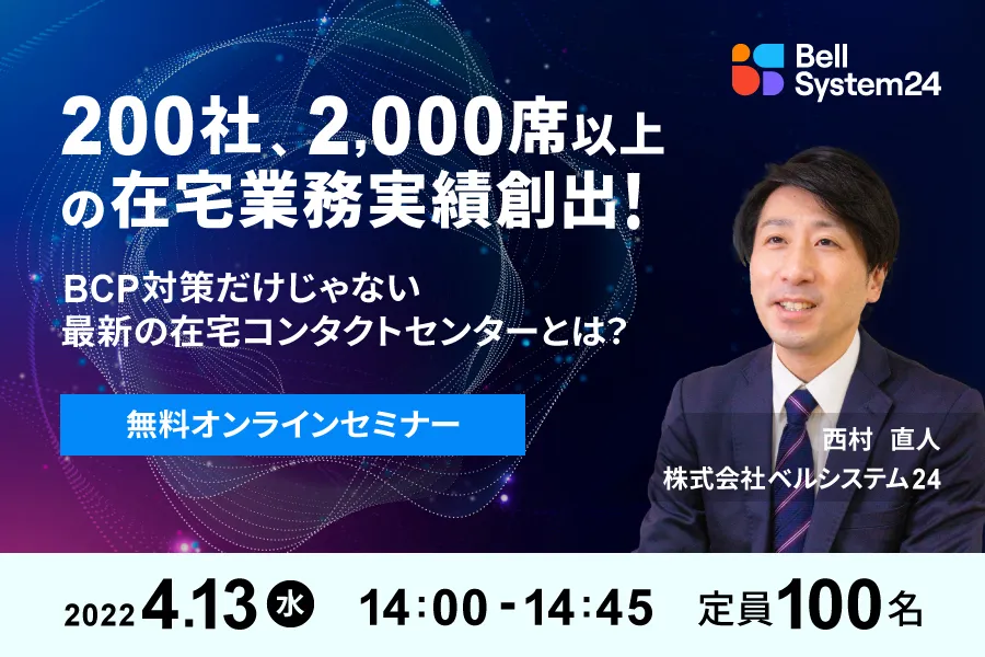 株式会社ベルシステム24(本社:東京都港区、代表取締役 社長執行役員:野田 俊介、以下:当社)は、2022年4月13日(水)、在宅コンタクトセンターをテーマとしたオンラインセミナー『「BCP対策」だけじゃない最新の在宅コンタクトセンターとは?』を開催します。