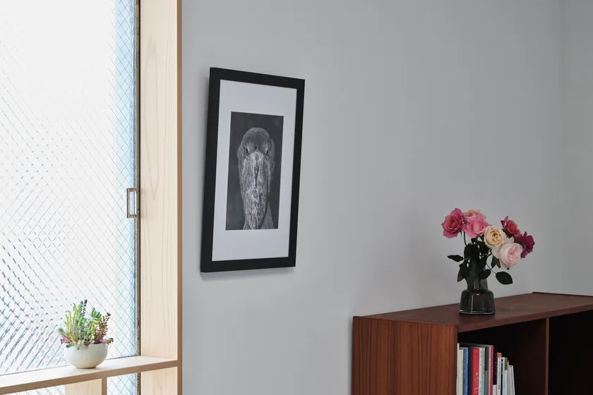 「SLICE」は内側に向かうささやかな斜面で構成されている額縁です。このわずかな傾きが作り出す陰影が、作品を静かに彩ります。額縁と作品の間を限りなく薄くすることで、作品と額の一体感を生み出しています。またSLICEは今までのALUMIUMシリーズで初の背面からの取り付け(トンボ)式を採用していて、作品の展示がより容易になっています。